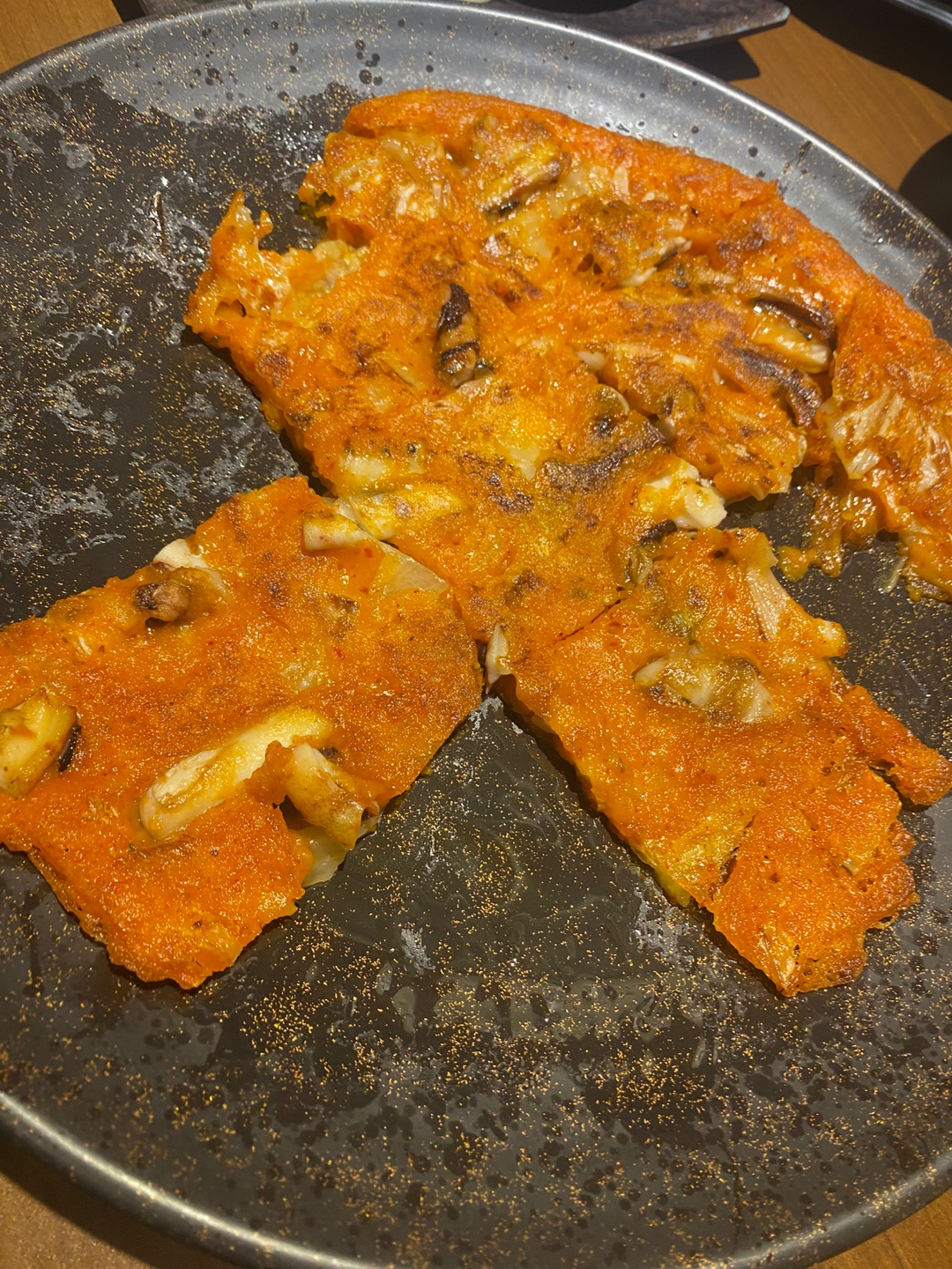 오징어와 김치가 푸짐하게 들어간 김치전! 크기도 크고, 바삭하고 속은 촉촉, 두부찌개랑 찰떡궁합이었어요.